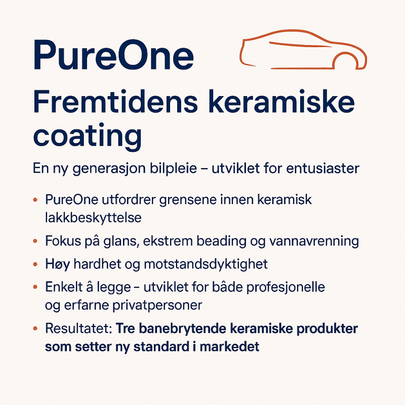 Oppdag den ultimate hverdagshelten innen keramisk belegg! Med en garanti på 100 000 km eller 5 år, tilbyr PureOne Track enestående holdbar beskyttelse. Vår unike ettlagsformel gir et eksepsjonelt hydrofobt belegg med høytytende kjemisk motstand, uten å endre det visuelle utseendet til overflatene. PureOne Track sin hydrofobe barriere binder seg til overflaten på et molekylært nivå, og avviser aktivt væsker og forhindrer at forurensning setter seg fast. Den beskytter mot bensin, spylervæske, kjølevæske, fugleskitt, veisalt, UV-stråler og mye mer, og forhindrer falming, skader og flekker på kjøretøyets lakk.